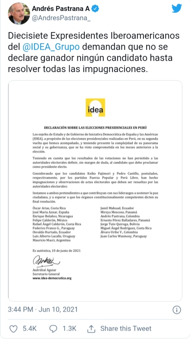!Expresidentes Iberoamericanos del IDEA demandan que no se declare ganador ningún candidato hasta resolver todas las impugnaciones», escribió.