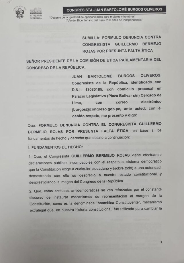 El documento fue presentado ante la presidencia de la Comisión de Ética (la cual todavía no ha sido definida en el Poder Legislativo) y acusa a Bermejo de una presunta falta ética por lo que calificó como actitudes “antidemocráticas” y en desprecio del “orden constitucional”.